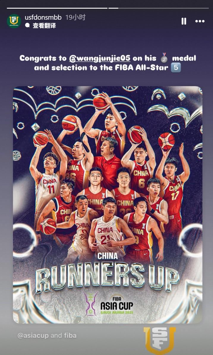 旧金山大学在社媒配文:“祝贺王俊杰获得亚洲杯亚军,并入选赛事最佳阵容。”